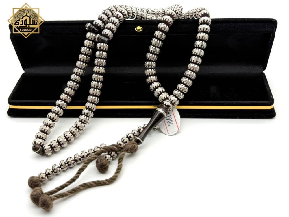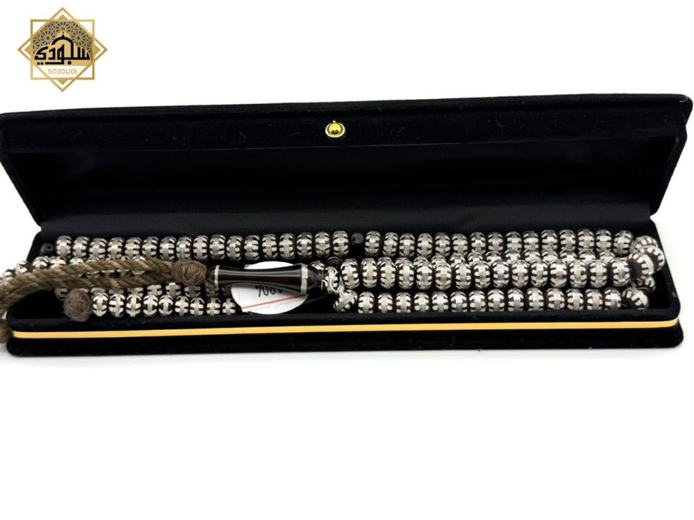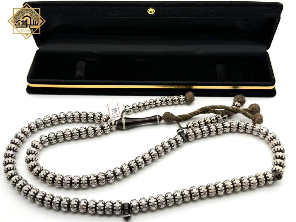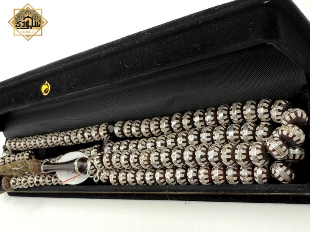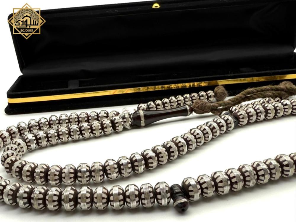 سبحة عدد (100) مصنوعة من خشب الكوك مطعمة بالفضة وبها عدادين اضافيين.